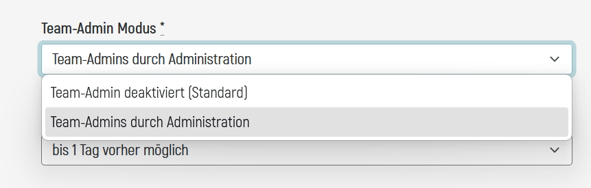 Standardmässig ist der Team-Admin Modus deaktiviert. Wenn ihr "Team-Admins durch Administration" anwählt, könnt ihr als Admins bestimmen, wer den Status eines Team-Admins übernehmen darf.